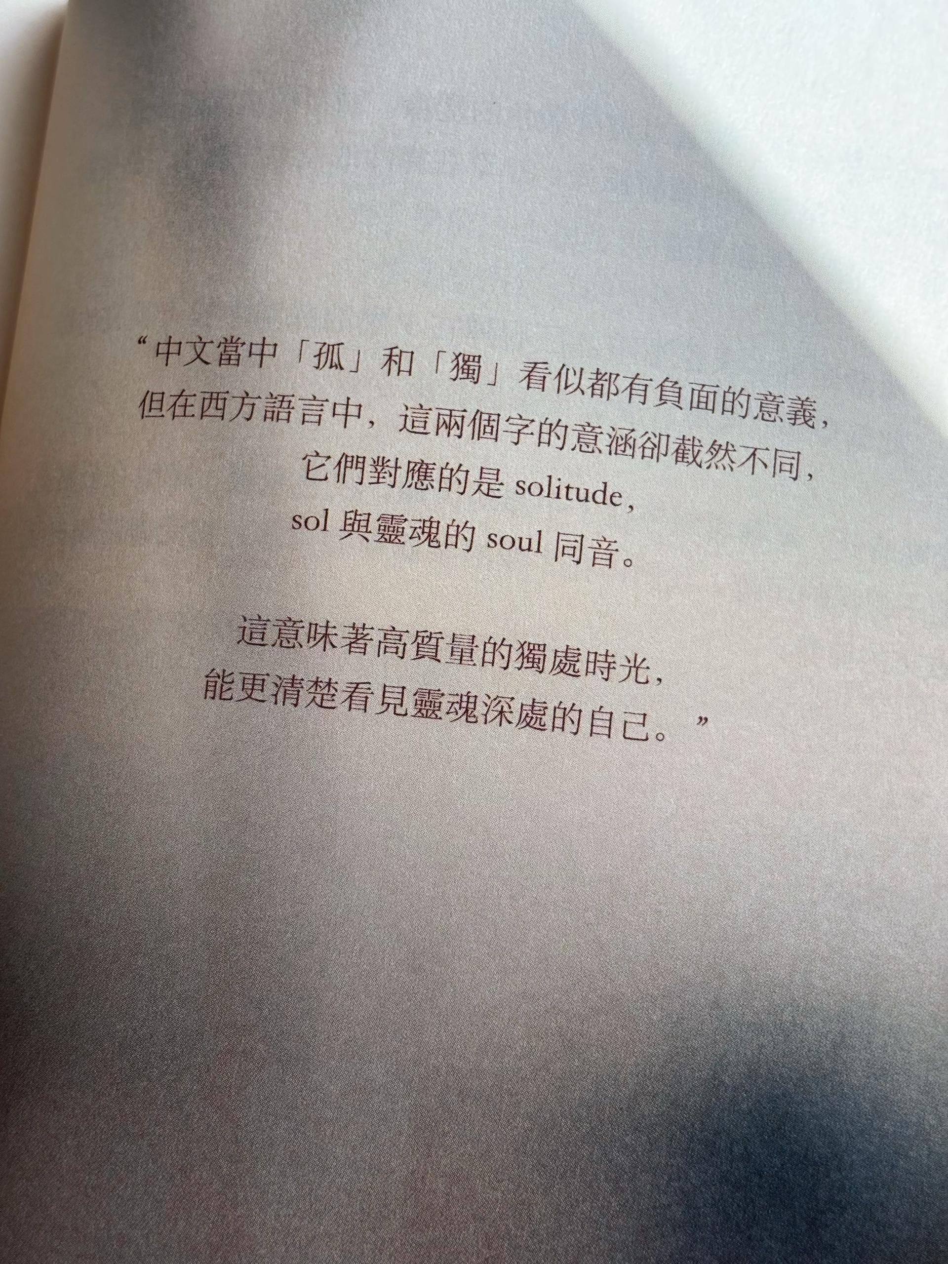 中文当中「孤」和「独」看似都有负面的意义, 但在西方语言中,这两个字的意涵却截然不同, 它们对应的是 solitude,sol 与灵魂的 soul 同音。